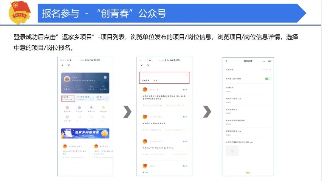 2.参加实践:返乡后按照当地团组织和用人单位要求,及时了解岗位、认知岗位、适应岗位,加强学习,高质量完成岗位任务;要遵纪守法、诚实守信、保守秘密,积极主动参与具体工作,彰显新时代青年大学生的精神面貌和责任担当。